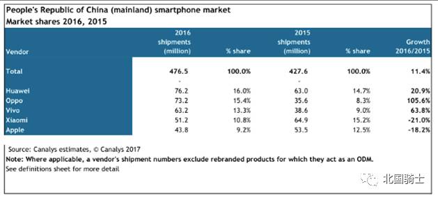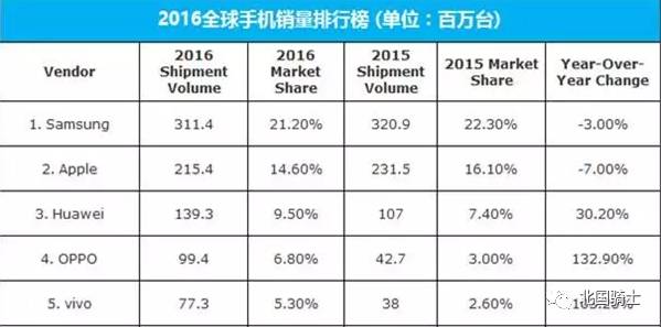 来自IDC的数据也显示,2016年国内智能手机销售量最高的是OPPO、华为和vivo,也只有这三家品牌的销售量在快速增长。